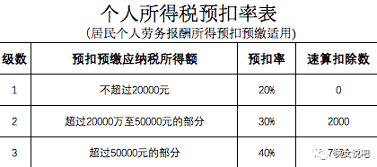 劳务报酬所得个税=预扣预缴应纳税所得额*对于税率-速算扣除数(备注:劳务报酬所得税率及对于的速算扣除数对应下表)