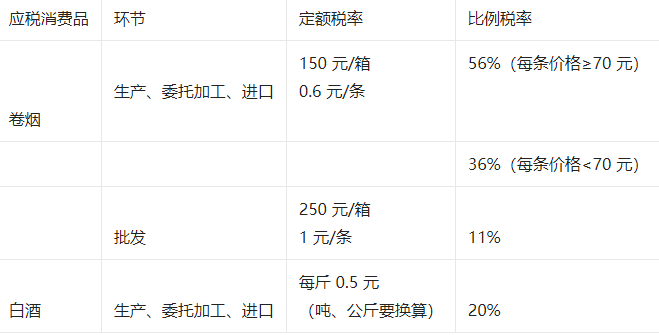 3、定额税率+比例税率:白酒、卷烟 2 种复合计税。