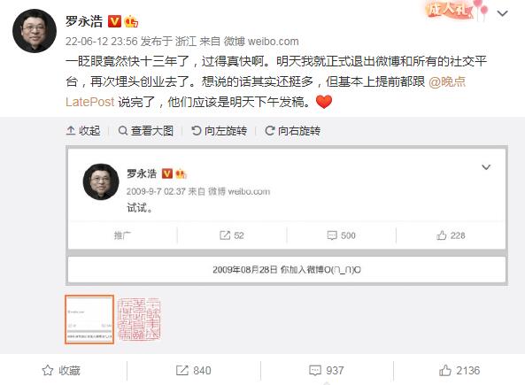 中新经纬6月13日电 6月12日晚间,罗永浩发布微博称,将再次埋头创业,并退出所有社交平台。