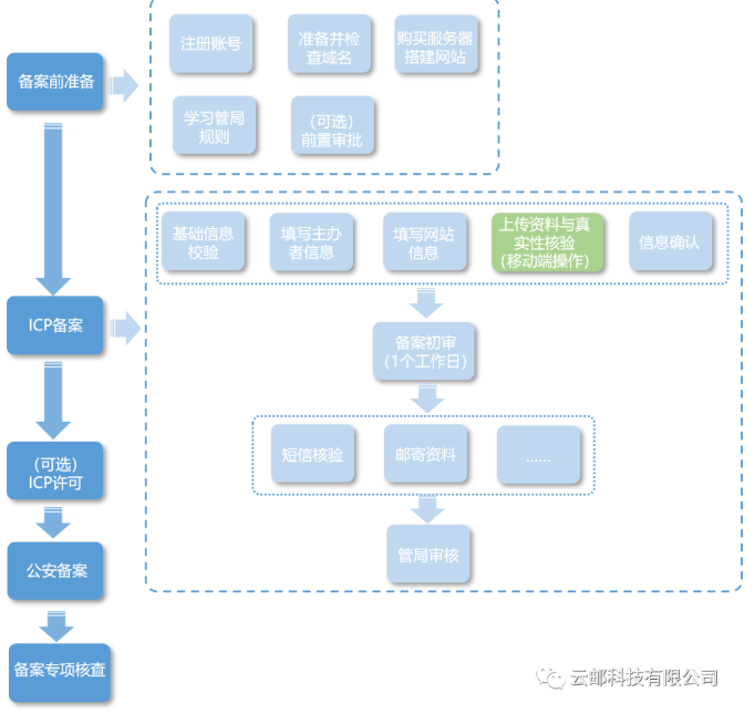 ICP备案前您需准备ICP备案所需的相关资料,通过PC端或App端进行备案信息填写、资料上传、真实性核验等,备案信息提交后需通过阿里云初审、短信核验和管局审核,整个备案流程预计所需时长约1~22个工作日左右,具体时长以实际操作时间为准。