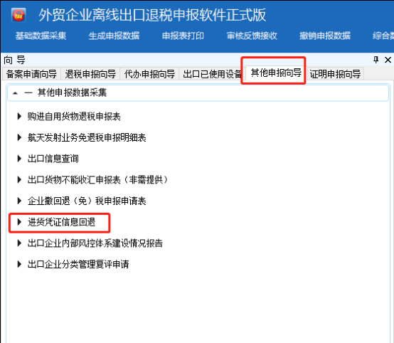 一、点击“其他申报向导”,选择“其他申报数据采集”中的“进货凭证信息回退”。