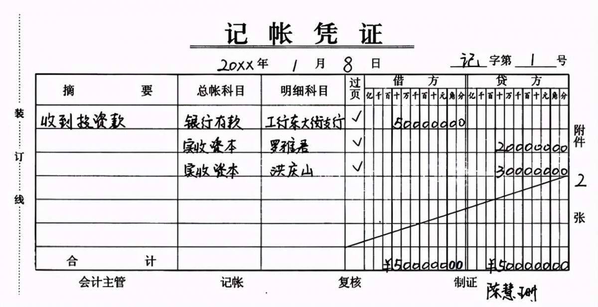 1、8日接受投资500000元,其中罗雅君200000元、洪庆山300000元(经济业务)