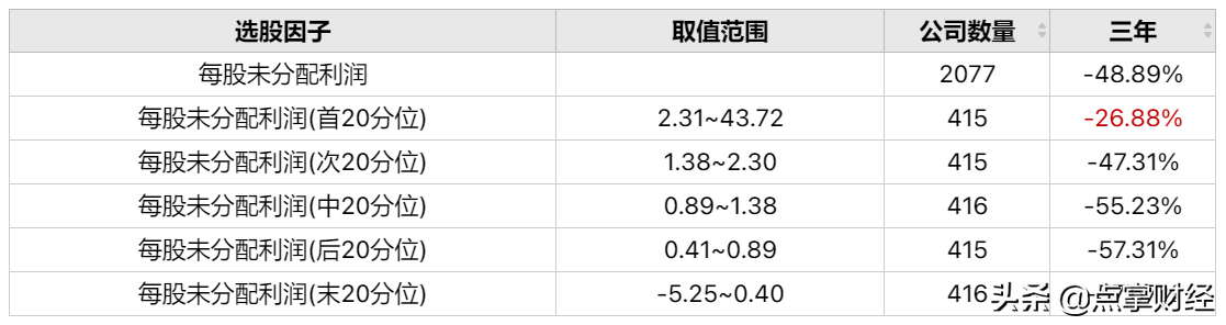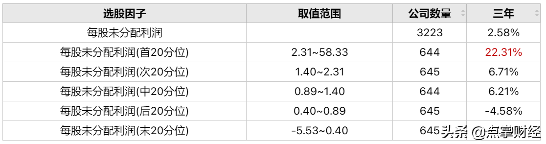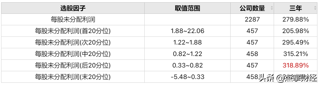 每股未分配利润是企业留待以后年度分配的结存利润累计额除以总股本得出来的,是公司今后扩大再生产或分红送股的重要物质基础。那么是不是每股未分配利润越多,股价涨幅越好呢?笔者将通过历史数据的回测来跟大家简单聊一聊。