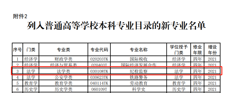 在21年的法考公告答疑中,官方只给出了7个专业,但是众众在教育部官网看到,在21年12月新增了一批普通高等学校本科专业,这其中,就包含法学类的纪检监察,也就是说,在2018年4月28日之后入学的“新人新办法”的新人,又多了一个可以报考法考的专业!