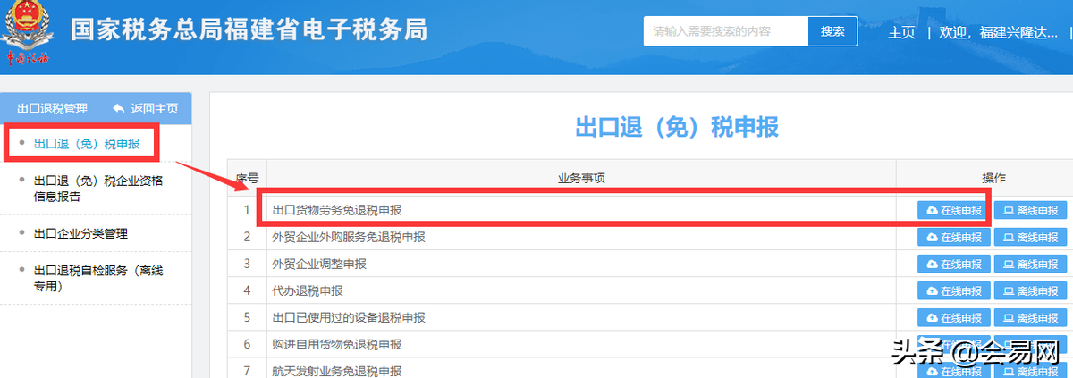 首先,登录电子税务局,点击“我要办税”模块下的“出口退税管理”,选择“出口退税管理”-“出口退(免)税申报”-“出口货物劳务免退税申报”-“在线申报”,如下图所示: