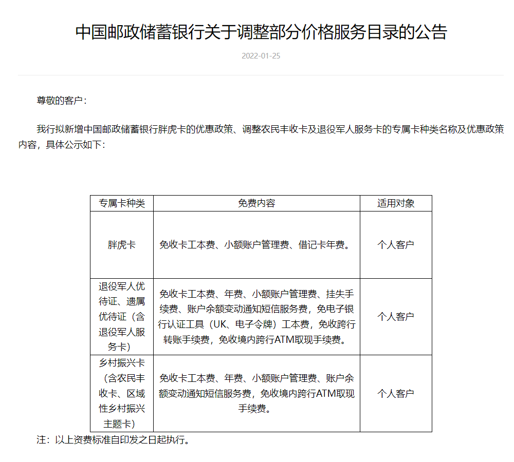 在同一天,邮储银行也发布公告称,免收胖虎卡工本费、小额账户管理费、借记卡年费,免收农民丰收卡及退役军人服务卡的账户余额变动通知短信服务费、境内跨行ATM取现手续费等。据了解,胖虎卡是近期由该行联合“我不是胖虎”IP推出的联名借记卡。