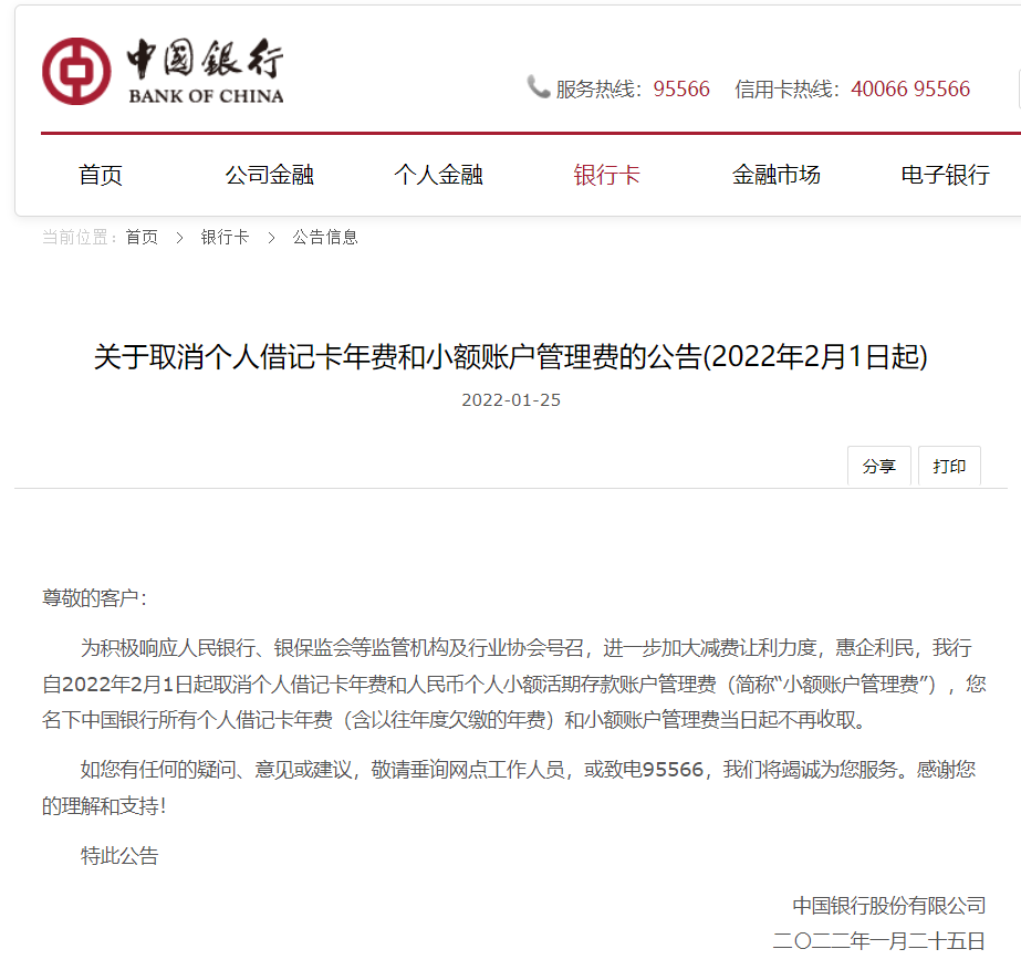 1月25日晚,中国银行官网发布公告称,将自2月1日起取消个人借记卡年费和小额账户管理费。