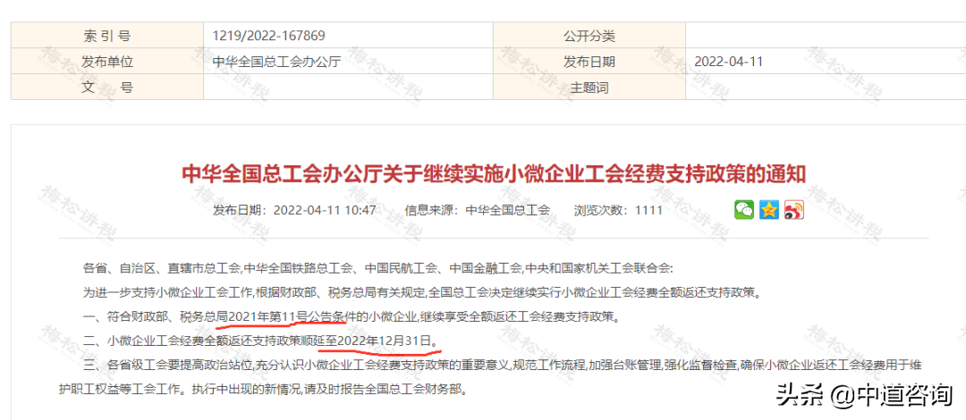 对小微企业工会经费全额返还,自2021年12月31日到期后,近期全国总工会办公厅又发布延期通知: