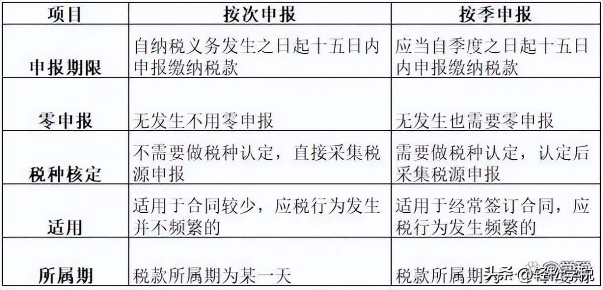 我们建议业务比较多的,不要选择按次,不然容易遗漏或者忘记,造成涉税风险。大家可以根据自己的业务量和实际情况,进行按次或按季的选择。具体按次和按月申报对比,下表可供大家参考: