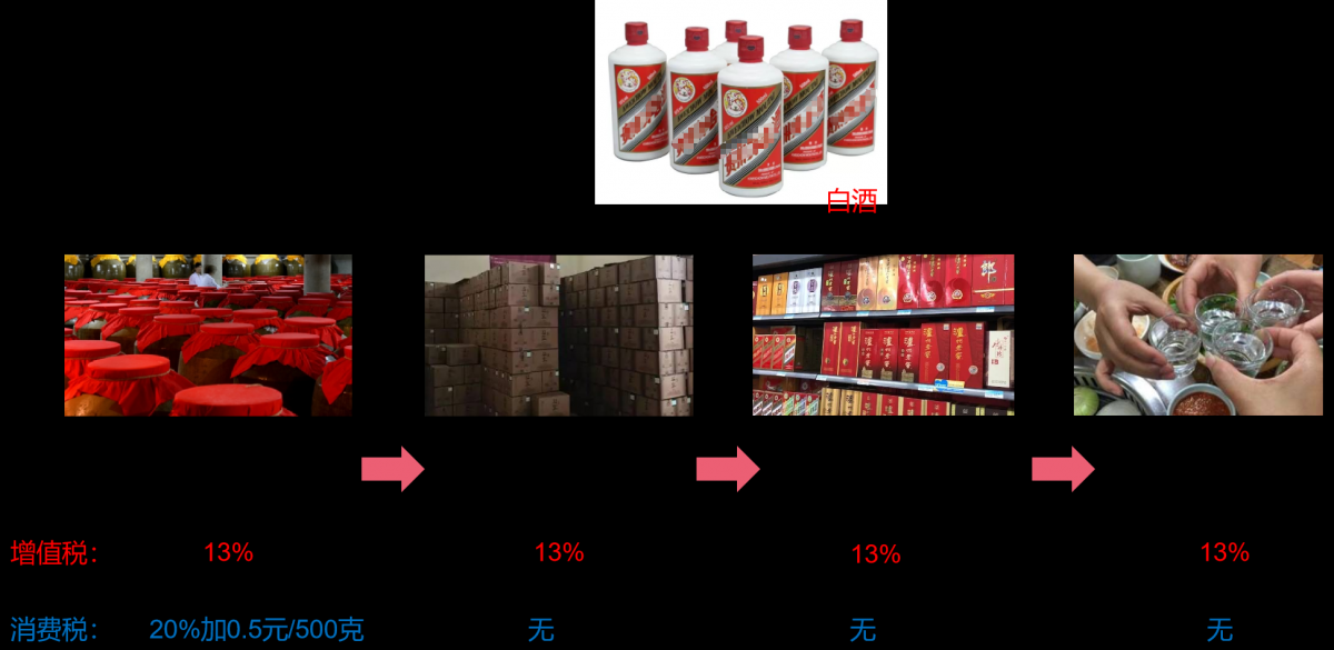 在上述的增值税链条中,虽然每个环节都需要征收增值税,但实际上,这些增值税最终都是由消费者来承担的,消费者所支付的3164元,实际上是在茅台酒厂的出厂价2000元的基础上,加上各环节的增值额和增值税之后的结果,即(2000+260)+(500+65)+(300+39)。