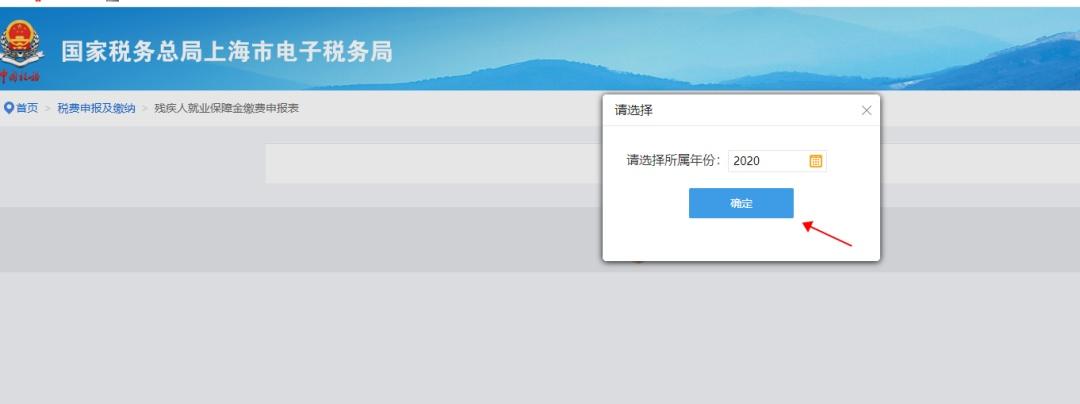 点击【残疾人就业保障金申报】模块,根据需要申报的残保金的所属年份选择对应年份“2020年“进入,点击”确定“进入下一步操作。