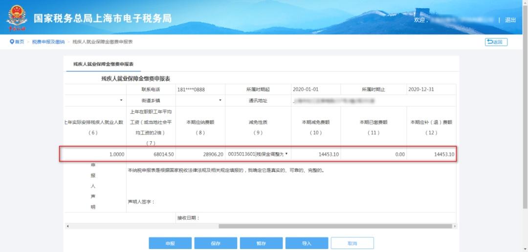 核对残保金申报表中的各个数据项是否准确,注意:申报表内容无法修改。核实无误后【保存】,点击返回主界面。