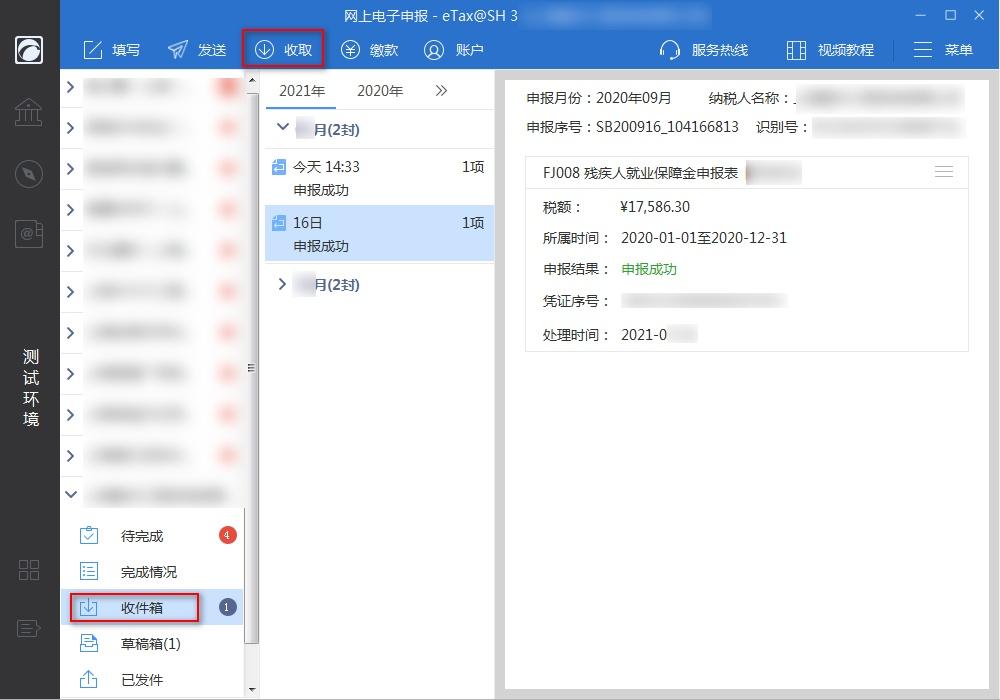 残保金申报表发送完毕会自动收取回执。如未自动收取成功,可通过主界面的【收取】功能手动收取。回执内容可通过【收件箱】查看。