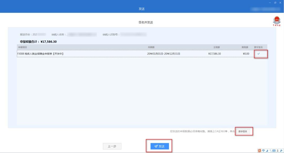 选中要发送的申报项目,点击【下一步】,点击右下角的数字签名后完成数字签名,点击【发送】。