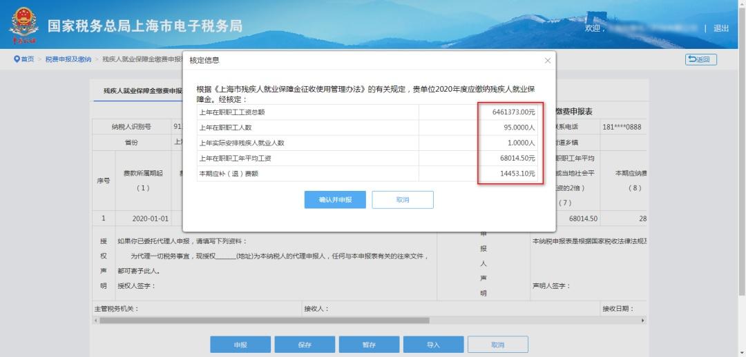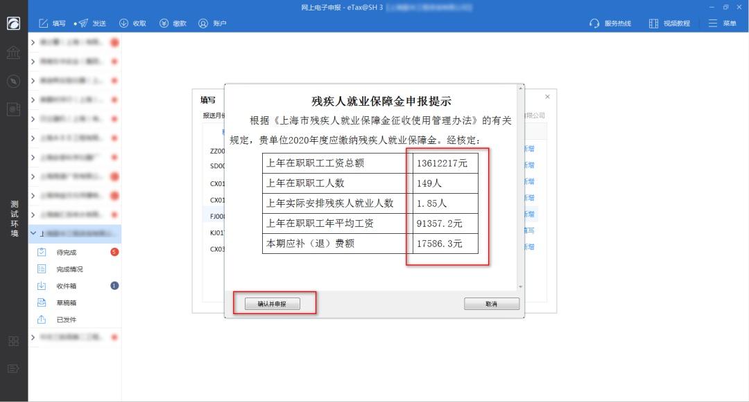 进入申报界面后系统展示残保金征收信息,确认征收信息无误后点击【确认并申报】。