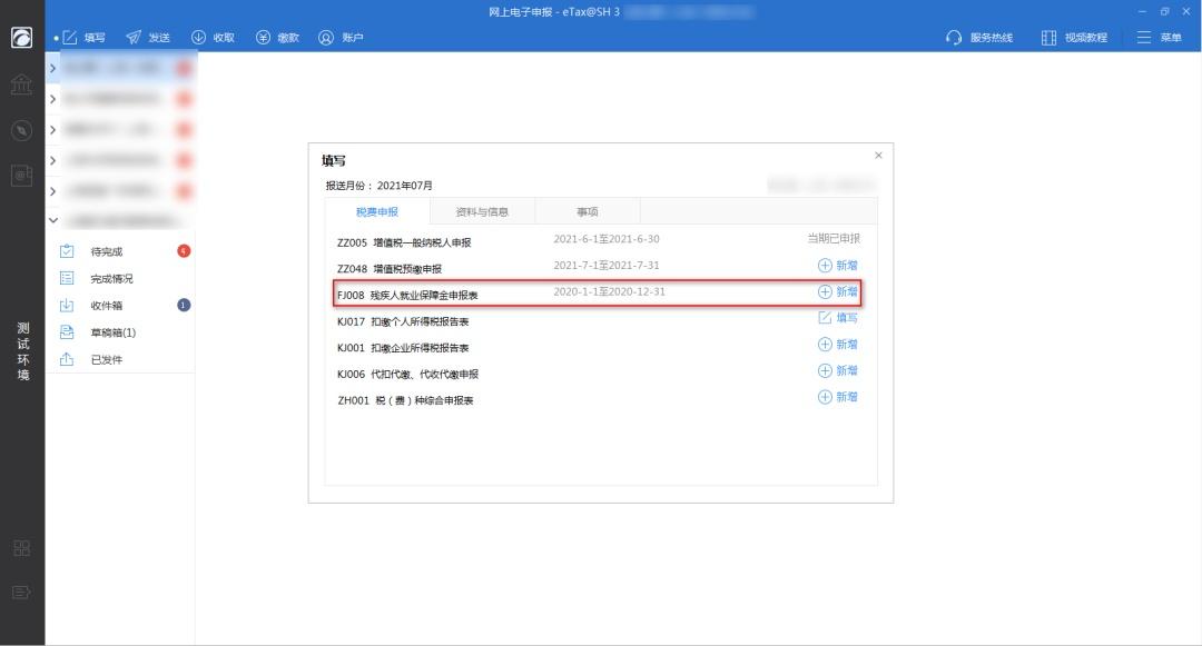 选中需申报残保金的单位,点击左上角的【填写】,进入填写界面,找到【FJ008残疾人就业保障金申报表】,点击后面的新增,进入申报年度选择界面。