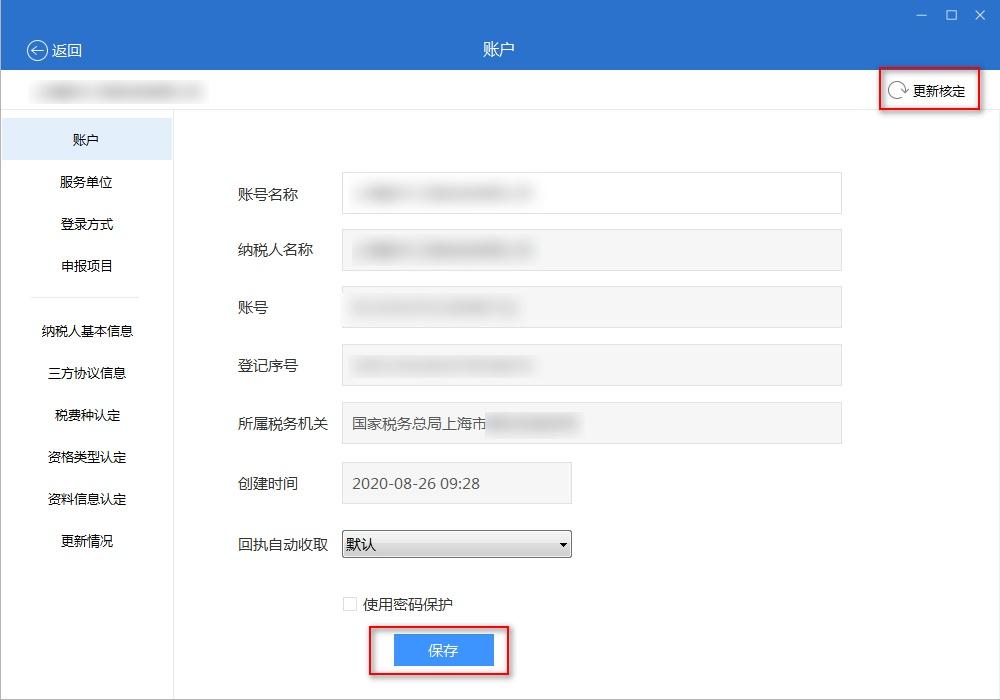 更新纳税人核定信息,以确保后续申报准确性。选中需要申报的单位,点击【账户】,进入账户界面,点击右上角【更新核定】,待更新完毕后点击【保存】即可完成更新核定。