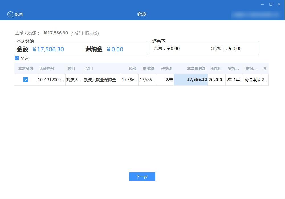 残保金申报表发送完毕自动收取回执,系统出现【缴款】按钮,点击直接进入缴款界面。或点击主界面【缴款】功能进入缴款界面。核实信息无误即可点击【下一步】。