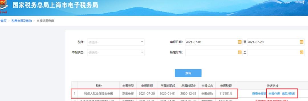 申报完成后自动跳转至申报结果查询界面,点击【缴款/查询】进入缴款界面。如申报有误,可点击【作废申报】作废该申报记录,将征收数据还原至未申报状态。