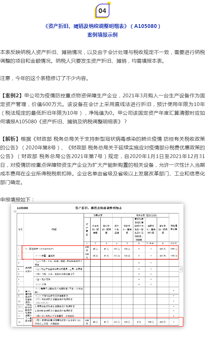 六、《资产折旧、摊销及纳税调整明细表》(A105080)案例填报示例