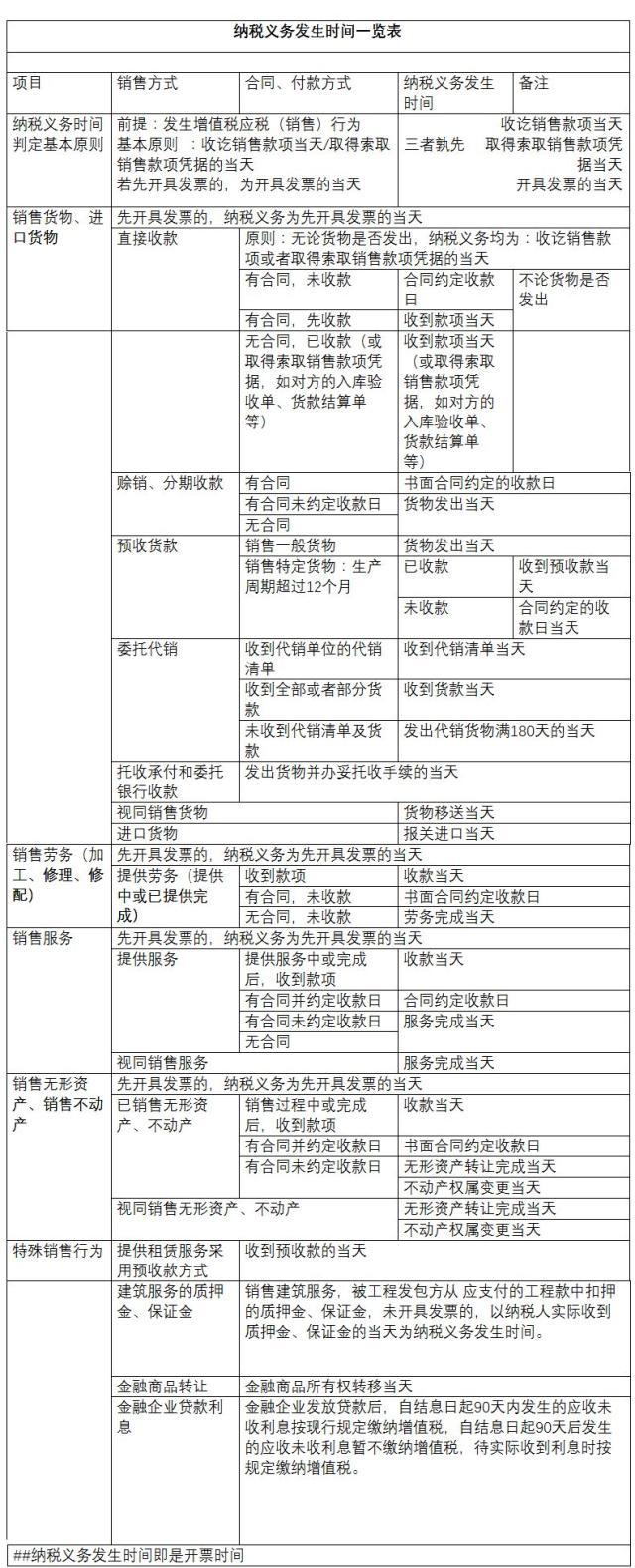 因此,该不该开票,该不该取得发票,需根据双方之间发生的增值税应税(销售)行为、结算方式和合同约定来判断。现总结增值税方面的法规,将各项业务不同结算方式与开票时点(纳税义务发生时间)的关系列为一张表,帮助你一表掌握增值税纳税义务发生时间与开票时点。