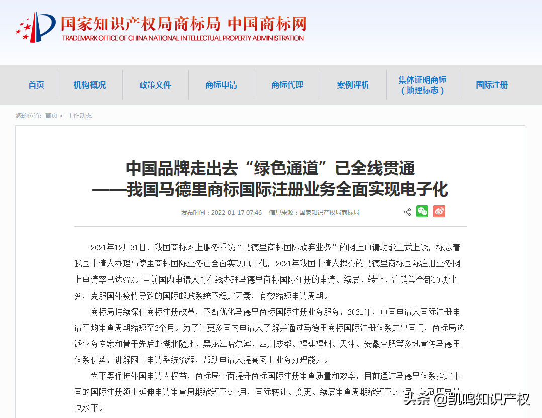 近年来,商标局持续深化商标注册改革,不断优化马德里商标国际注册业务服务。目前,我国商标网上服务系统“马德里商标国际放弃业务”的网上申请功能已上线,我国申请人办理马德里商标国际业务已全面实现电子化,2021年我国申请人提交的马德里商标国际注册业务网上申请率已达97%。2021年,中国申请人国际注册申请平均审查周期缩短至2个月。