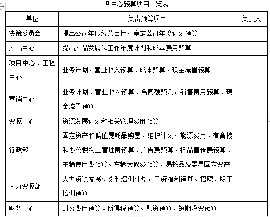 3) 决策委员会根据公司整体发展战略和各业务发展战略,讨论预算工作组和预算委员会提出的建议,董事长和各业务总监分别测算、提出预算年度公司经营目标和各业务经营目标。然后得出公司目标利润、各业务中心目标利润、营业规模等最后结论,下达给预算委员会至预算工作组;