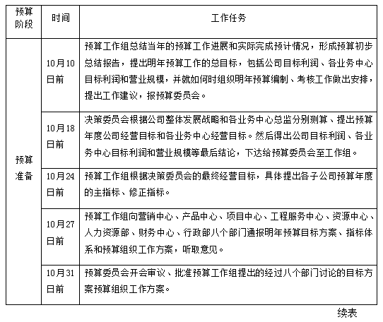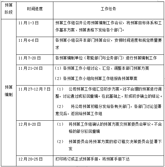 预算编制工作按公司会计年度组织,每年的预算提前一个季度(3个月)进行,分为预算编制准备、预算编制、预算确定三个阶段。各阶段的工作任务、时间进度如下表: