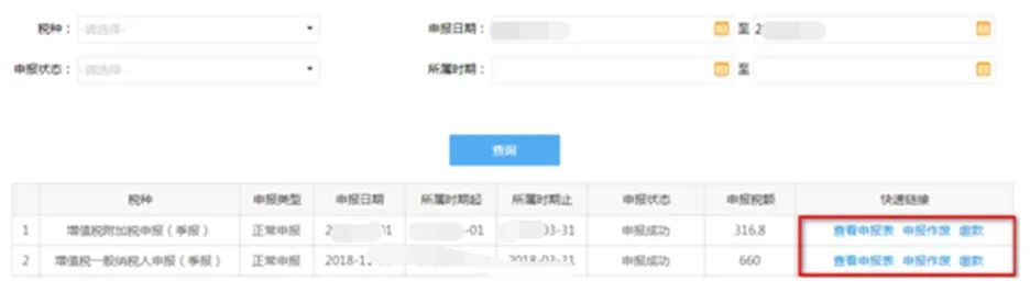 步骤三:申报成功后,可以立即查看申报结果(是否成功);录入申报日期等信息后,可以查询到申报结果。可点击【查看申报表】查看已填写的表单信息,可点击【申报作废】作废该申报记录。可点击【缴款】完成税款缴纳。