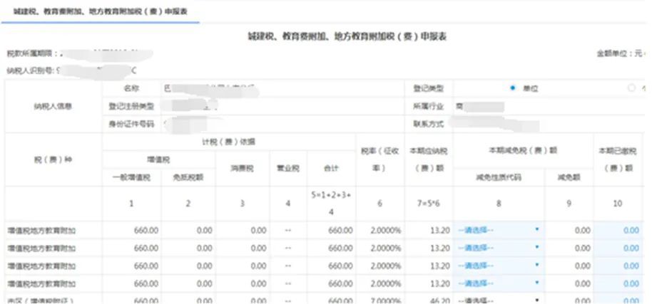 步骤二:纳税人按要求填写《增值税纳税申报表(一般纳税人适用)》以及各张附表。确认填写完整、无误后,点击保存、申报;增值税申报后将自动跳转至相关附加税费申报界面,据实填写报表“一般增值税、免抵税额、消费税、本期减免税(费)额、本期已缴税(费)额”等内容。