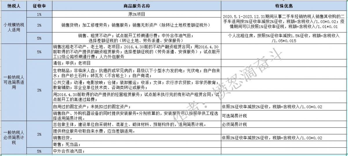 表格列示了小规模纳税人适用的征收率,一般纳税人可以选择适用简易计税的情形,一般纳税人必须选择简易计税的情形。