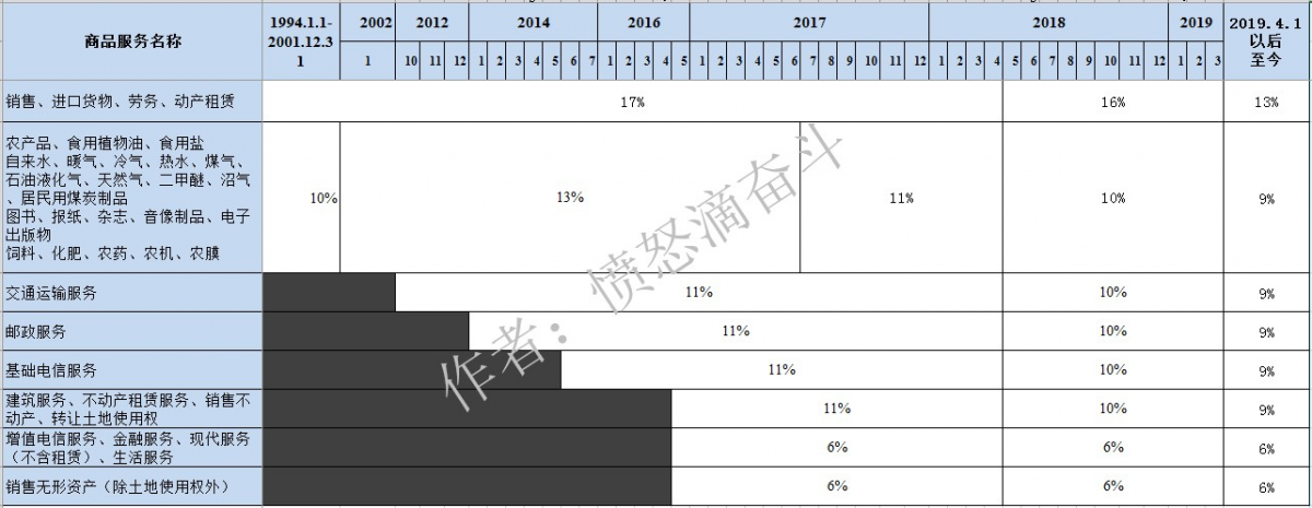 收录自1994年开始实行的增值税税率,于2012年开始至2016年4月30日的营改增的变化,2018年5月1日开始的税率变化,2019年4月1日开始的税率变化。