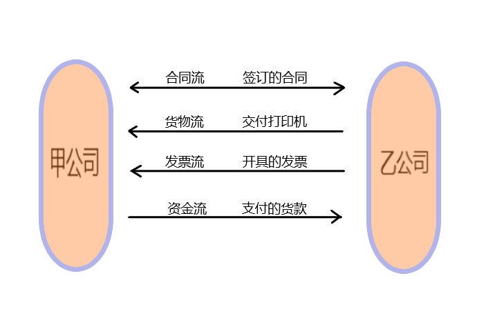 那在这个例子里。合同流是甲公司与乙公司签订的合同,货物流是乙公司把打印机运到甲公司进行了交付,发票流是乙公司向甲公司开具的发票,资金流是甲公司向乙公司支付的货款。