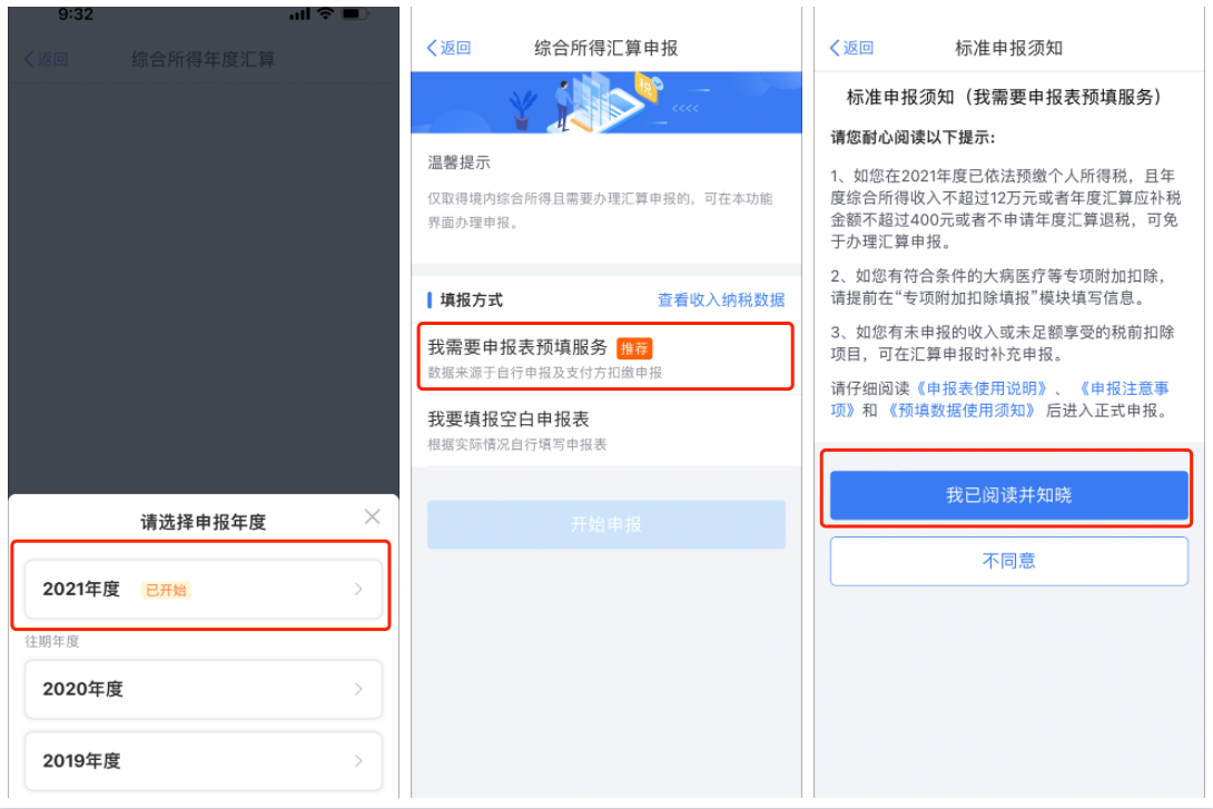 选择2021年度, 选择我需要申报表预填服务, 点确认