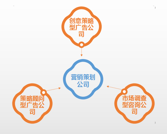 创意策略型广告公司、策略顾问型广告公司、市场调查型咨询公司由营销策划公司细分而来。营销策划公司主要以品牌策划、营销策划等为主,这三种类型的公司互有合作、互有竞争,与广告商形成多元化的合作。在市场经济快速发展、各种信息爆炸的当下,充当客户的眼睛,以高效率的信息资源整合,协同客户一起发展成为新一代行业的先锋。