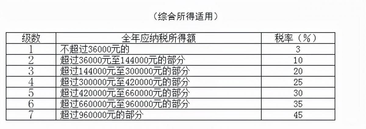 综合所得是指居民个人取得的工资、薪金所得;劳务报酬所得;稿酬所得和特许权使用费所得,适用百分之三至百分之四十五的超额累进税率(预扣率表见前述一、二)。