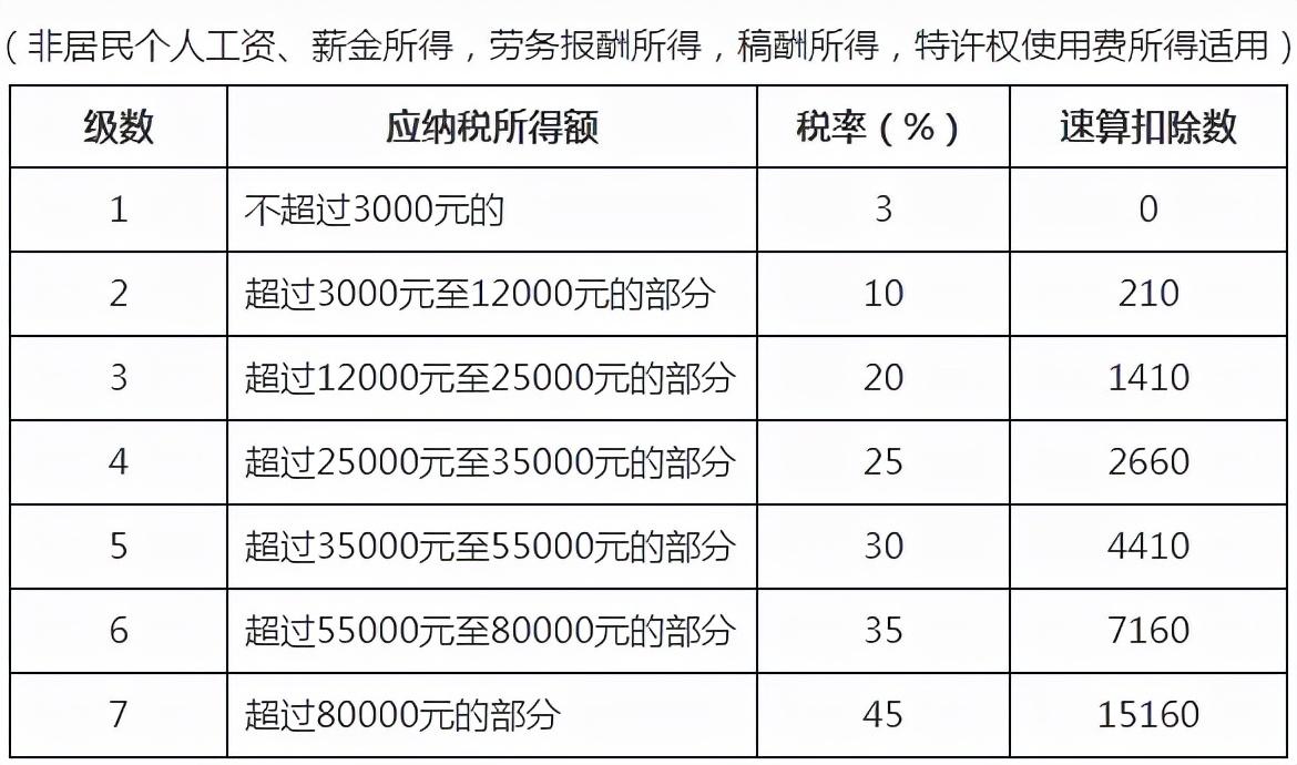 2.非居民个人取得工资、薪金所得;劳务报酬所得;稿酬所得和特许权使用费所得,依照本表按月换算后计算应纳税额。