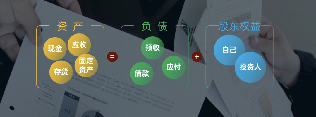 而把这五笔钱全部加在一起,负债(预收、应付、借款)+股东权益(自己、投资人),就是你的资产。