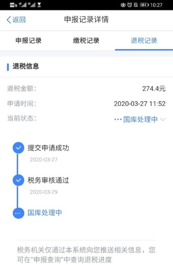点击上方的退税记录,我们可以查看状态。小编目前已经处在处理状态,只用安静等到账啦~