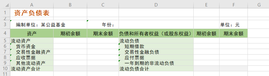 4、创建电子表格。新建电子表格,并填入资产负债表的各个指标,如下: