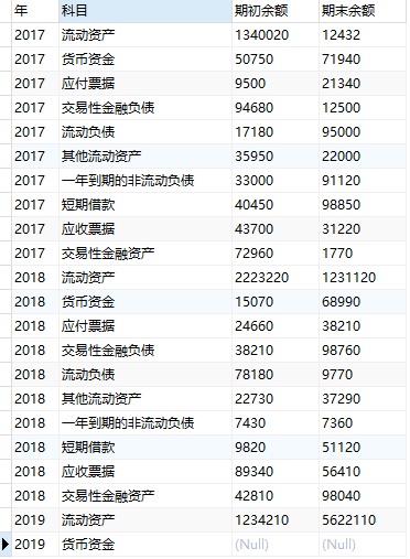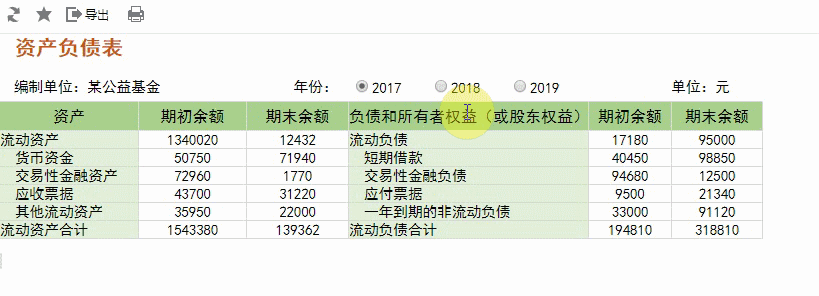 如上图,表格中如“流动资产”“货币资金”“短期借款”等数据,都是直接从数据库中获取。当切换年度指标后,数据也随之变化。