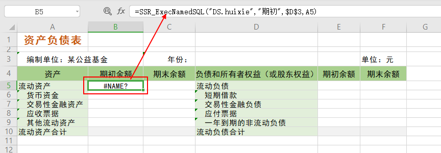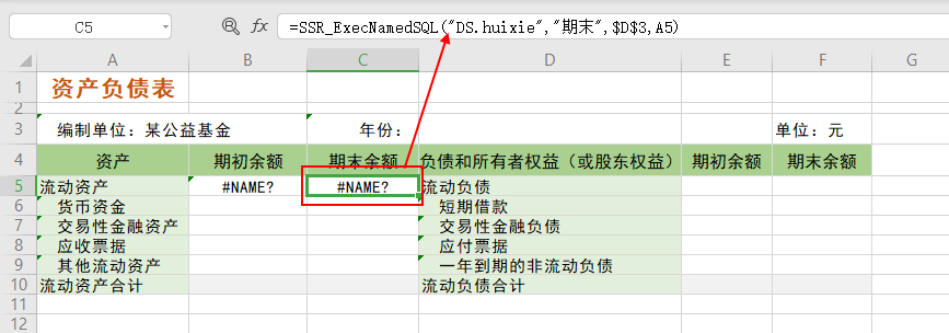 7、设置“流动资产”的期末余额。选中单元格C5,填入公式:=SSR_ExecNamedSQL(“DS.huixie”,”期末”,$D$3,A5)