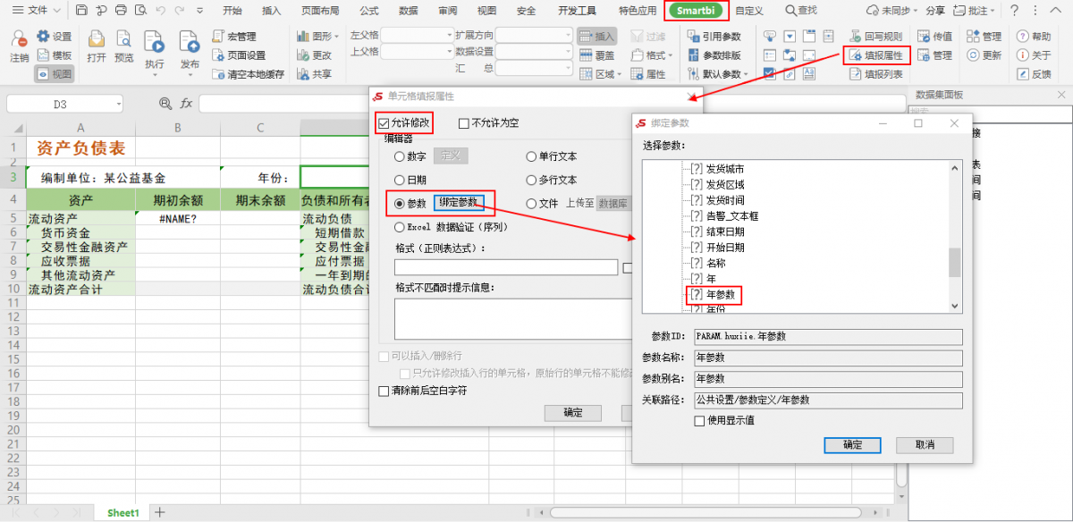 5、设置年参数。选中D3单元格,点击工具栏的 填报属性 ,在弹出的“单元格填报属性”窗口,选择“允许修改”“参数”,点击 绑定参数 按钮,弹出“绑定参数”窗口,选择“年参数”,如图: