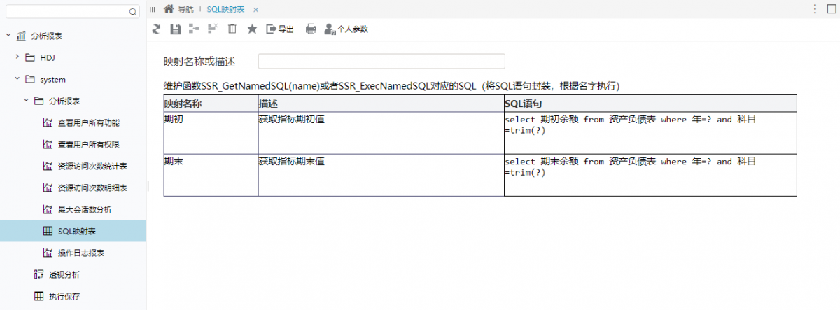 在“分析展现”界面的左侧目录区“分析报表”目录下,点击 system > 分析报表 > SQL映射表 ,填写两个命名SQL,如下: