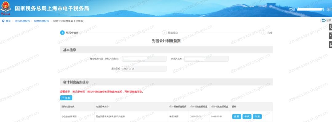 若之前已有财务会计制度备案信息,则会显示会计制度备案信息列表,可以进行【查看】、【修改】、【作废】等操作。(若记录有误,请先作废或修改原备案有效期再新增备案信息,如果对应会计制度执行期间已经报送过对应的会计报表资料,则不可再作废原备案,只可终止此备案信息的执行期止。)