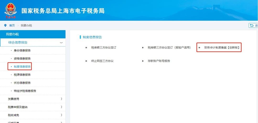 点击菜单栏中“我要办税”中的“综合信息报告”模块,在弹出页面右侧选择“制度信息报告”,点击“财务会计制度备案”进入办理页面。