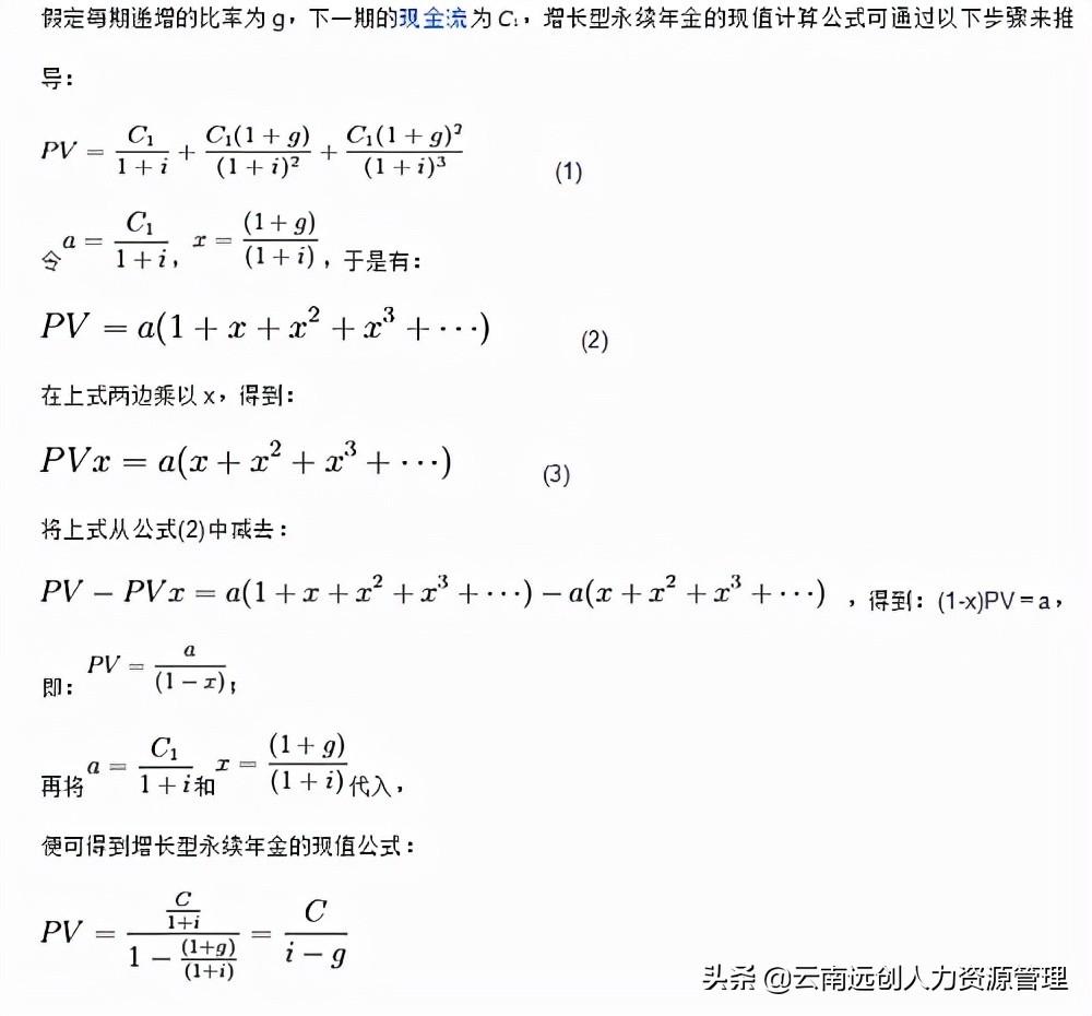 如果不是当年开始,而是递延了T年,从T+1年开始,则T年现值同上pv=c/r,然后把这个看成终值再折现到现在,就是除以(1+r)^t, 合起来就是pv=c/(r*(r+1)^t) 如果这两个都懂了,第一个减去第二个就是中间一段的现值。