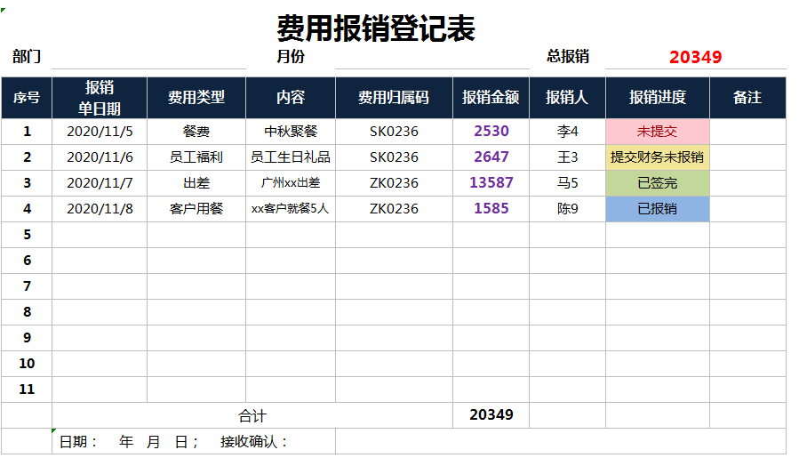 费用报销登记表