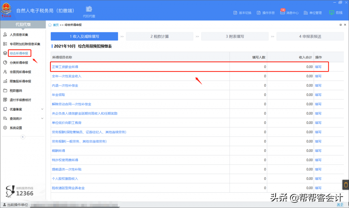 2、左侧列表,选择“综合所得申报”,点击“填写正常工资薪金所得”