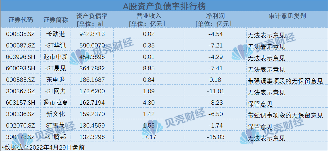 高居资产负债率榜首的为退市在即的长动退(000820.SZ),截至2021年末公司资产总计1.23亿元,负债合计11.57亿元,资产负债率达942.87%。